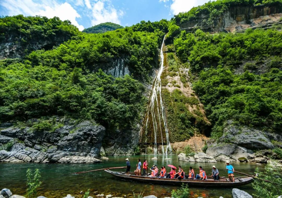 “快看!悬崖上真的有悬棺!”游船刚驶入峡谷深处,船舱内便响起阵阵惊叹。神农溪是国家级风景名胜区、国家5A级旅游景区,发源于“华中屋脊”神农架南麓,由北向南穿行于深山绝壁之间,最终汇入长江。两岸绝壁如削,古栈道遗迹悬于半空,千年悬棺神秘肃穆,碧绿溪水倒映着峰峦叠翠——这幅“山在水中生,人在画中游”的实景画卷,让地理与历史课本上的文字瞬间变得触手可及。