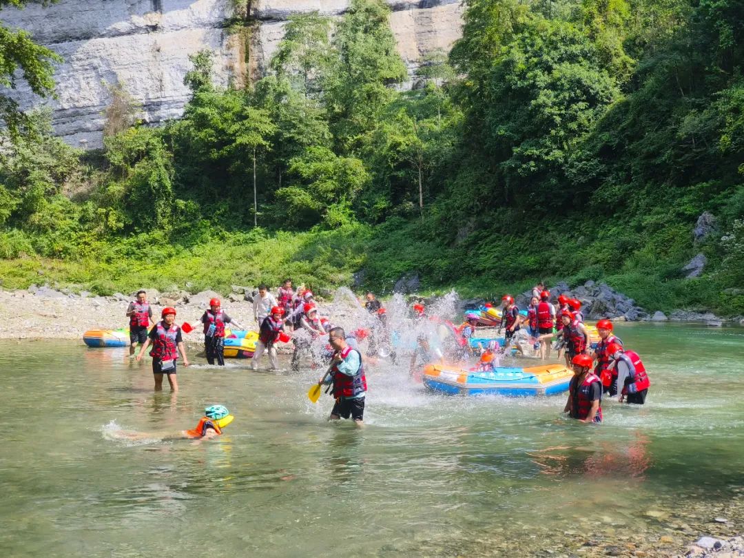 在黄金洞景区,职工们换上救生衣、戴好安全头盔,全员“全副武装”开启水上探险。随着皮划艇从滑道俯冲而下,首波激浪带来“透心凉”的洗礼,艇身颠簸间,团队信任与协作在惊险中悄然升华。冲下陡坡时,浪花轰然扑面,欢呼声与尖叫声响彻河谷;行至平缓水域,一场酣畅淋漓的“水上大战”随即爆发——水枪狙击、水瓢翻飞,头盔成了舀水“神器”,船桨化身攻防“武器”,水花四溅中,笑声与呐喊交织,职工们尽情释放压力,展现出超越日常的活力与默契。