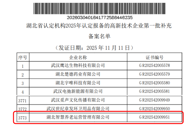 3月4日,全国高新技术企业认定管理工作领导小组办公室对湖北省认定机构2025年认定报备的高新技术企业第一批补充备案名单(详见附件)在高新技术企业认定管理工作网上予以公告,湖北康养集团旗下湖北智慧养老运营管理有限公司(以下简称“智慧运营公司”)通过湖北省科技厅、省财政厅、省税务局联合认定,位列其中。