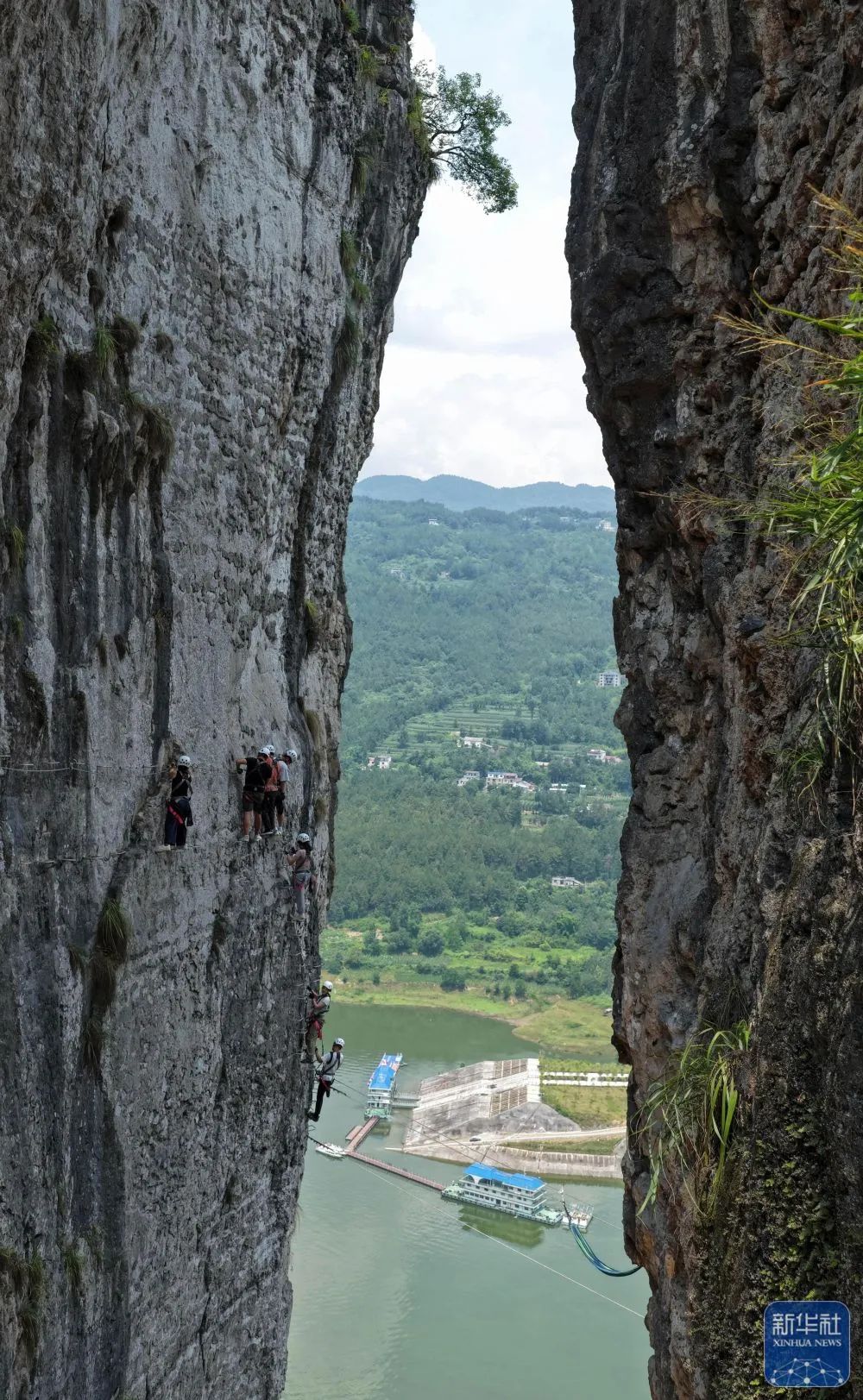 湖北省恩施市新塘乡红花峰林景区,游客在体验“飞拉达”攀岩项目。新华社发(赵军摄)