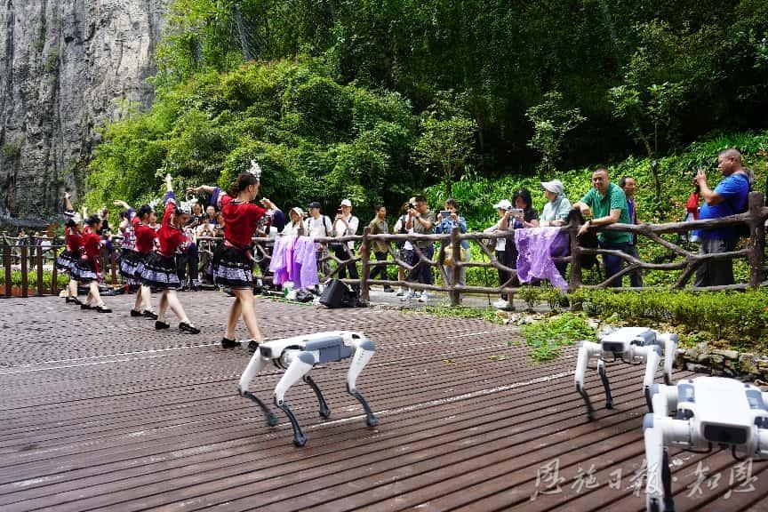 在景区迎客松处,旅行商们热情打卡,合影留念,“清江升白云”的奇景让大家宛如置身仙境。在“一炷香”前,旅行商们赞叹大自然的鬼斧神工。热情奔放的土家族摆手舞与悠扬民歌交织,让嘉宾们沉浸其中、流连忘返。景区内,机器狗跳起舞蹈,外骨骼装备整装待发,无人机带飞的VR视野将峡谷全貌尽收眼底,让大家以“上帝视角”饱览大峡谷的雄奇壮美。