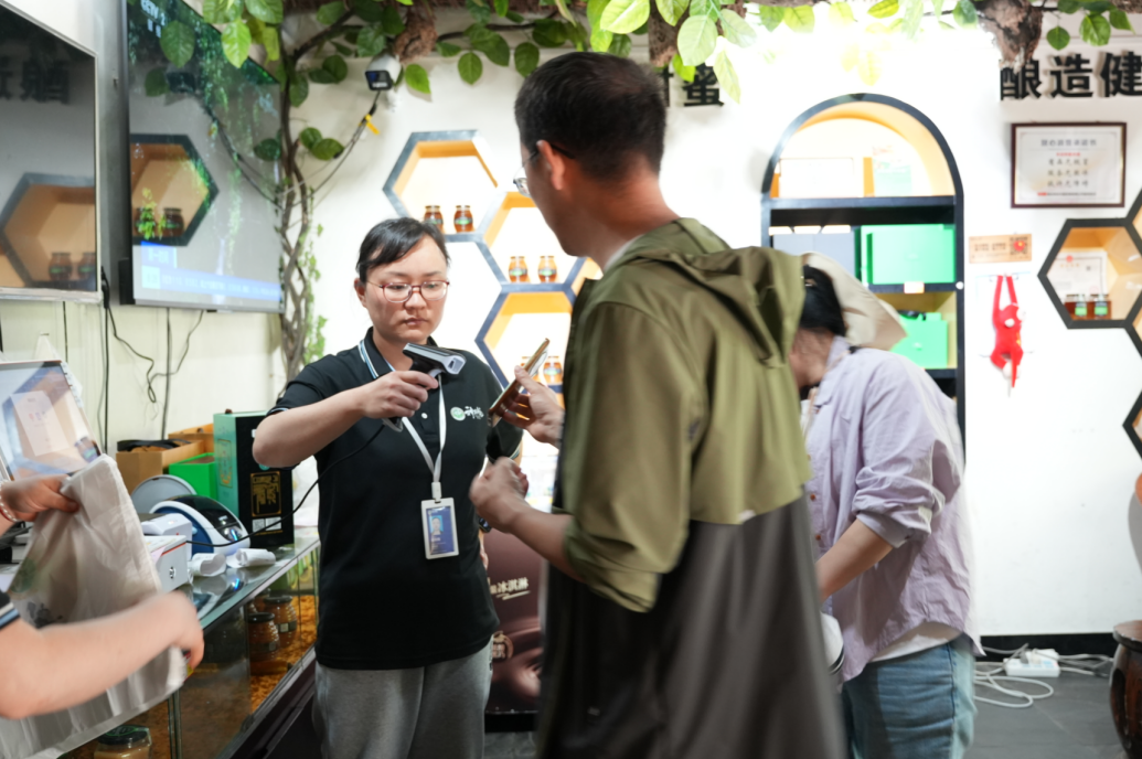 在熊猫馆文创店,店长黄庆玉正在热情向小朋友介绍熊猫玩偶、熊猫挂件等产品,在她的介绍下,一个个小朋友很快购买了钟意的产品。同样在养蜂人家的店长候利梅也使出浑身解数,耐心地为游客介绍金丝猴玩偶价格、展示蓝面金丝猴的独特之处,生动精彩地介绍瞬间收获了一批“粉丝”下单。