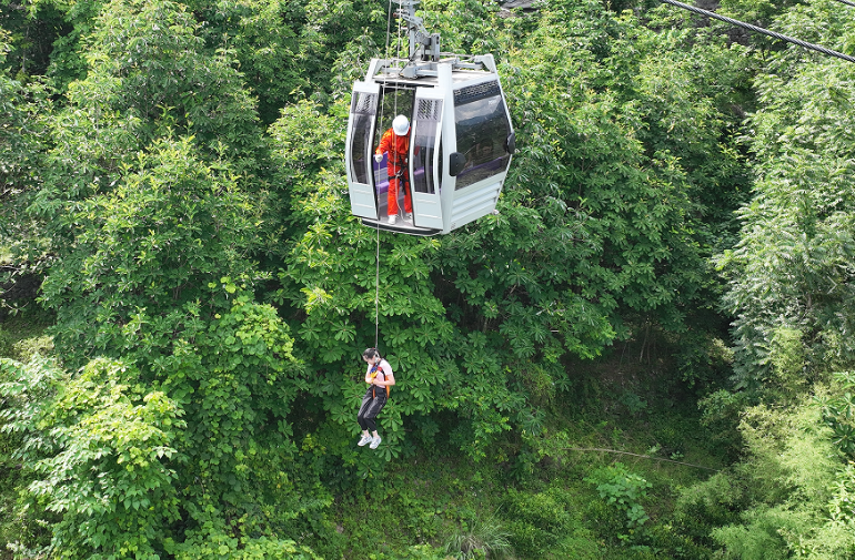 本次演练科目涵盖客运索道高空水平救援及垂直救援,模拟索道突发机械故障停车,并有游客滞留在多个吊厢内等待救援的情形。接到救援指令后,恩施大峡谷索道立即启动应急预案,各方力量迅速集结。操作人员熟练运用水平救援设备,高空救援操作人员与地面接应人员分工明确、配合默契。