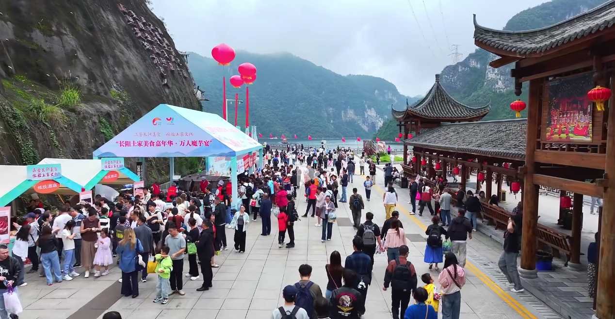 暖心补给增能量。在游客集中区域,设置了多个免费茶水点、休憩区,开展万人魔芋宴活动并免费提供给游客。