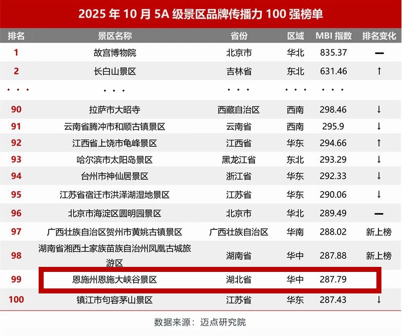 近日,迈点研究院正式发布榜单,恩施大峡谷表现卓越,同时跻身“全国5A级景区品牌传播力100强”与“华中地区5A级景区10强”,实现双榜题名!