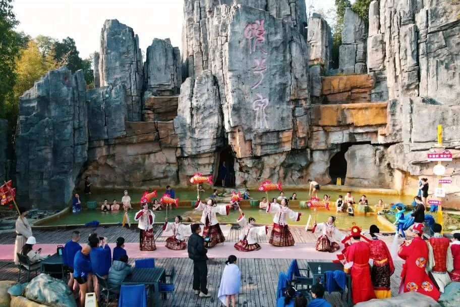 非遗民俗“潮”起来,传统年味焕新生。洪旅集团景区紧扣国潮热点,将非遗文化玩出新花样。悦兮半岛推出的鱼灯巡游、古装演绎等非遗展演,让游客沉浸式感受流动的民俗盛景;“财神贺岁”派发福袋、篝火晚会上共享热藕汤,让温情与惊喜在园区弥漫。金湾酒店则打造了马年潮玩会,砸金蛋、红包墙趣味横生;湿地生态园内,“欢乐套鸭”“蒙眼捉鸡”等田园游戏,更是让亲子家庭乐享乡野童趣,欢笑声不绝于耳。
