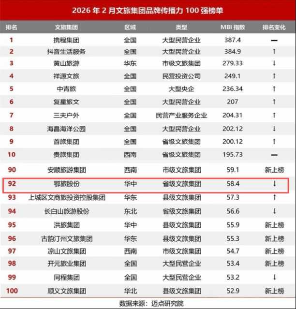 3月12日,迈点研究院2026年2月全国文旅集团品牌传播力百强榜单发布,鄂旅股份再度上榜,位列第92名。2026年以来,鄂旅股份连续跻身全国文旅集团品牌传播力百强,品牌实力与行业影响力再获权威认可。