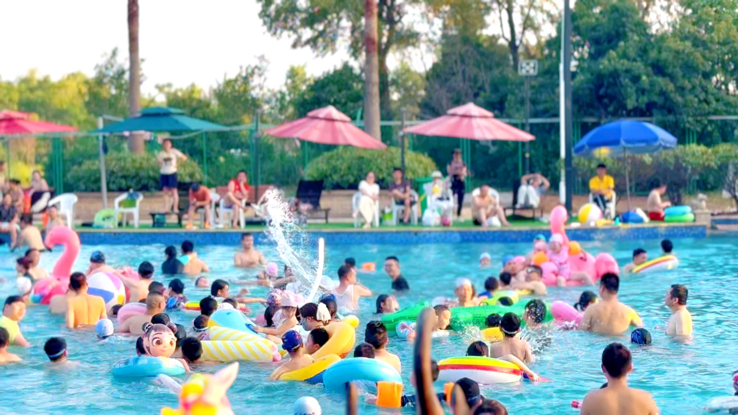 时隔2年,红莲湖酒店户外泳池再次开启,曾经火爆的热门打卡地,再次为周边居民带来清凉体验。泳池分为两大板块,最深水位分别为1.4米和0.6米,特别适合儿童戏水。每到黄昏,家长们带着孩子纷至沓来,泡在水中尽情嬉戏,享受欢乐的亲子时光。舒适的躺椅,茂盛的椰树,营造出浓郁的热带风情。据统计,户外泳池开放以来人气持续火爆,高峰日接待量超1000人,再次成为本地社交媒体上的盛夏热点话题。