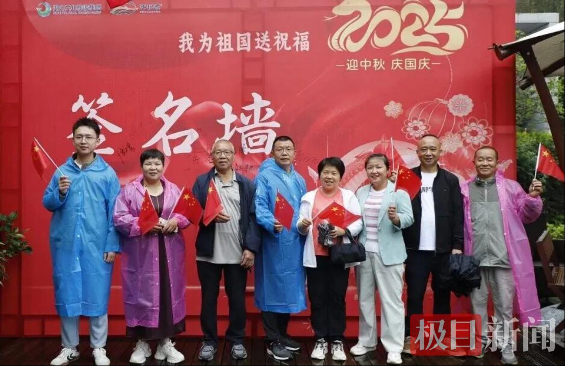 景区入口处,“我为祖国送祝福”签名墙前排起长队,游客们欣然提笔,留下一句句真挚祝福,现场洋溢着热烈而温馨的节日气息。