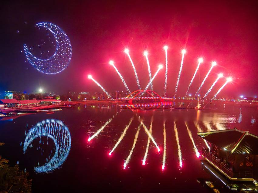 科技与艺术交织,夜空绽放爱国情怀。嘉年华期间,数百架无人机联袂焰火打造视觉盛宴。夜幕中,无人机方阵变幻出“五星红旗”“我爱中国”等图案,配合“蓝色马尾”“七彩祥云”等特效烟花,为游客呈现了一场沉浸式的光影艺术盛宴。据悉,该演出将于10月1日至6日每晚20:50准时上演,水广场、仙女台、见南阁、进士殿等地为最佳观赏点。