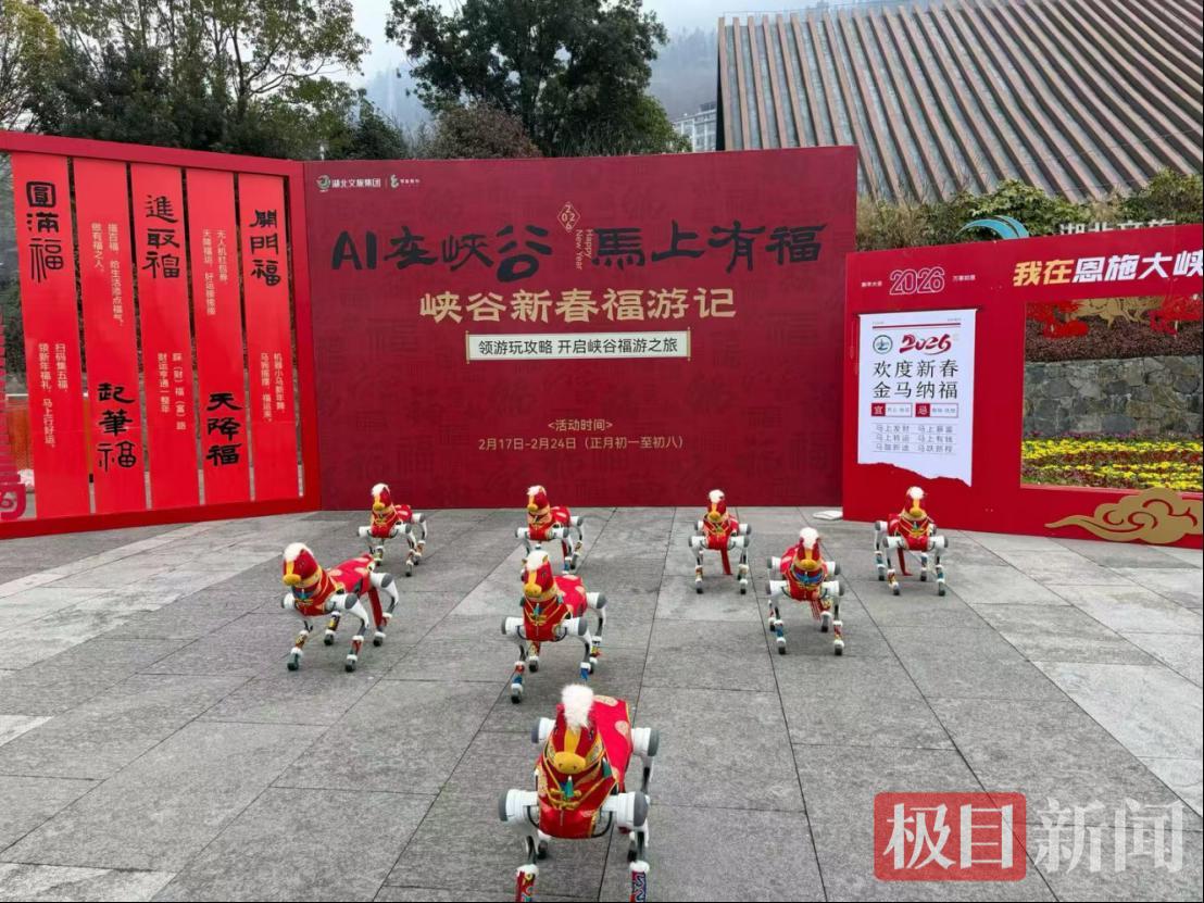 活动在充满土家韵味的开场舞《逮嘎嘎》中热力开场,舞者们用欢快热烈的舞步瞬间点燃了现场气氛,将新春的喜气传递给每一位游客。人群中,几只灵动俏皮的机械小马格外引人注目,它们化身“迎福小使者”,穿梭往来与游客互动,成为现场最吸睛的科技亮点。而喜气盈盈的“财神爷”则向游客们派发专属“福游指南”,引领大家开启一段福气满满的峡谷新春之旅。