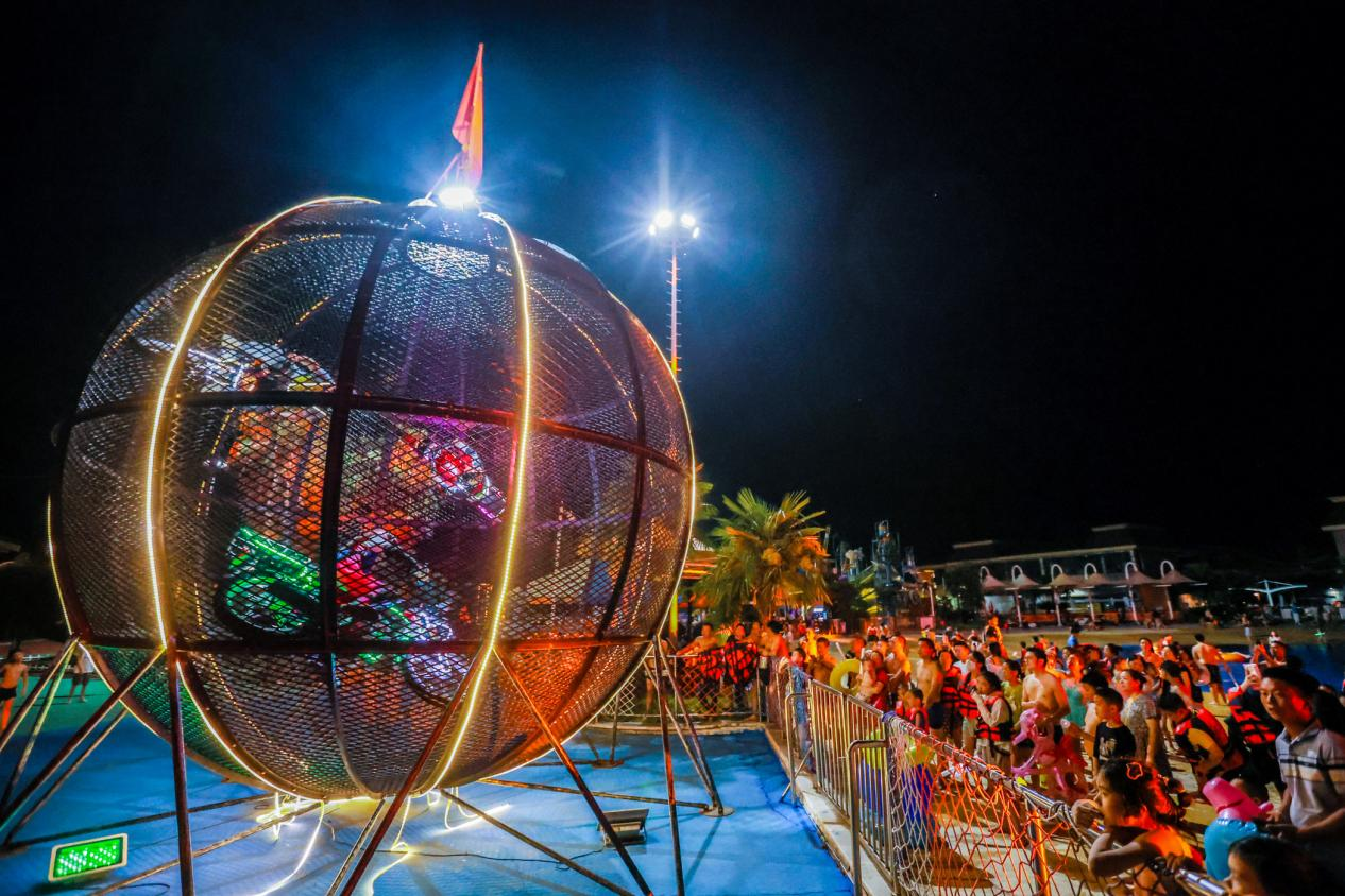 夜幕降临,水上乐园内人头攒动,钢丝飞车,环球飞车表演、疯狂海啸等活动震撼开演。伴随着激昂的音乐,一束束烟花直冲云霄,绽放出绚丽夺目的光彩。烟花的轰鸣声与游客们的欢笑声交织在一起,构成夏日夜晚里一曲美妙的乐章,让游客们在观赏飞车项目的惊险刺激后,感受烟花带来的浪漫。