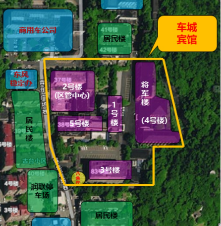 (2号楼现为东风汽车区管中心办公楼,不在本次车城宾馆焕新升级项目建设范围之内。)